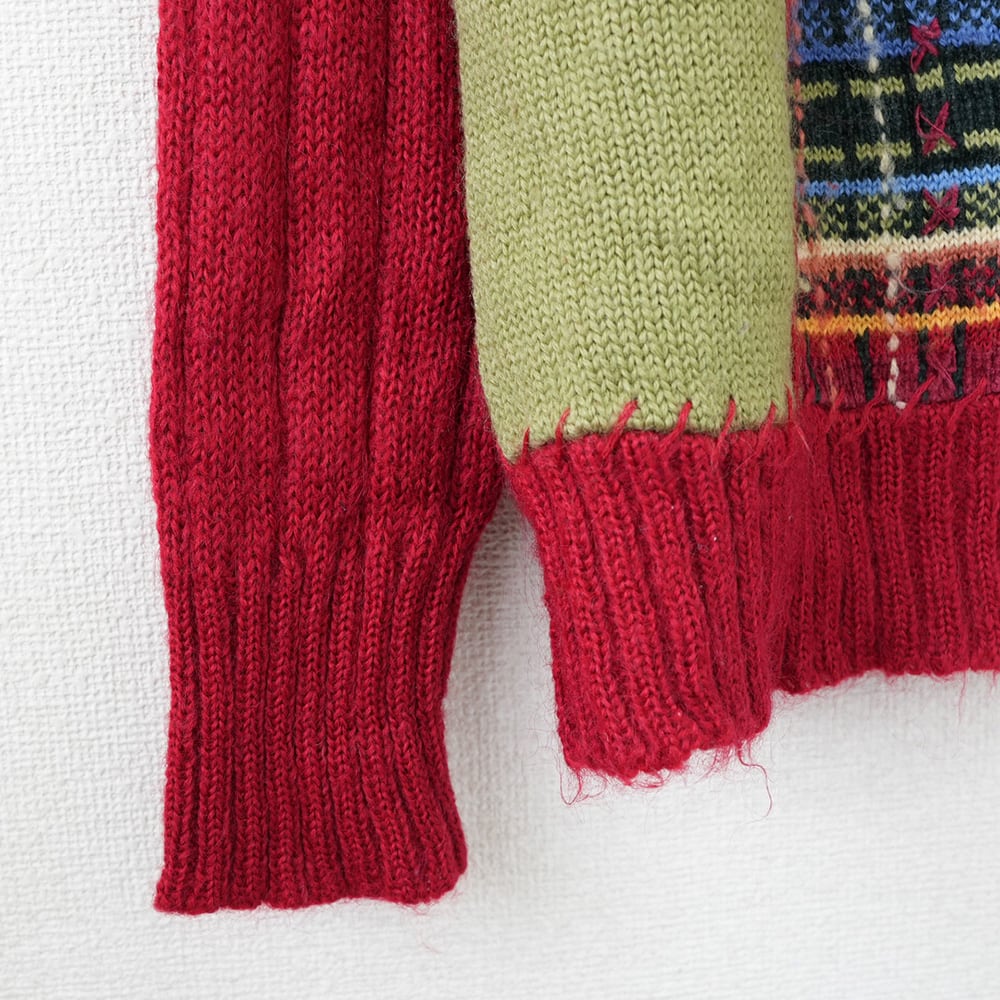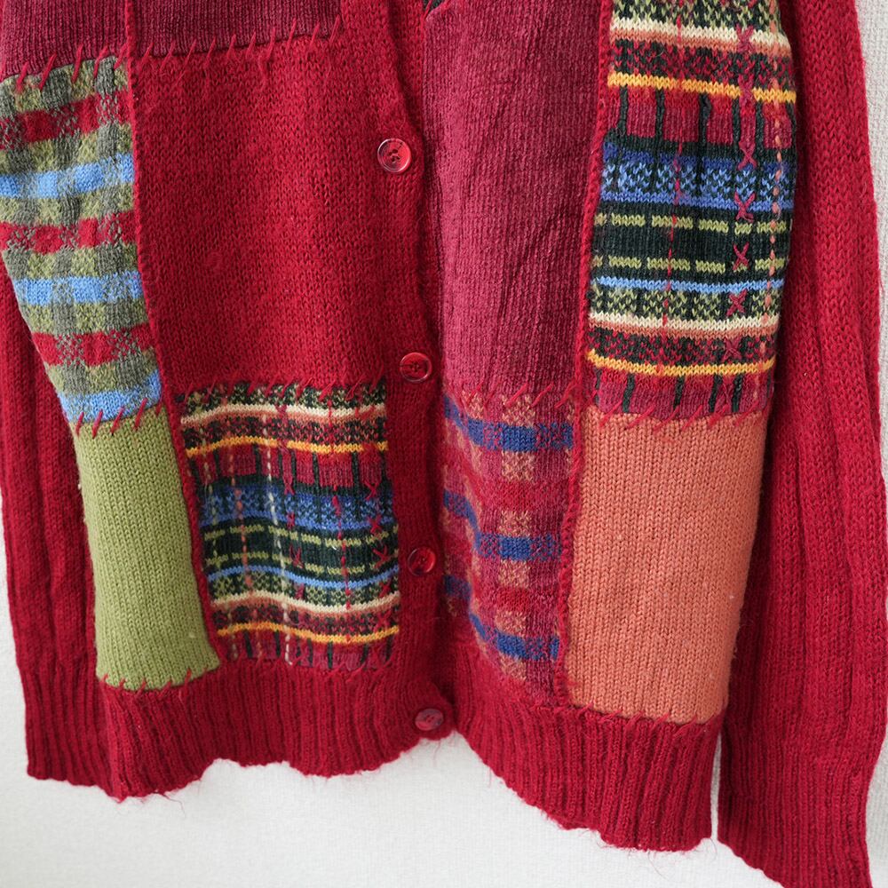 カーディガン ニット パッチワーク ウール アクリル モヘア レッド 赤 Lサイズ 古着【UR-0630】